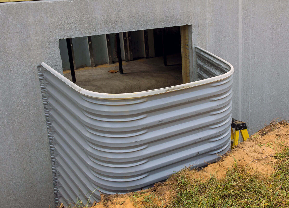 Window wells are semi-circular in shape and surround the basement window. Typically these are constructed from a solid barrier made of either corrugated galvanized metal, marsonry, plastic or pressure-treated wood.